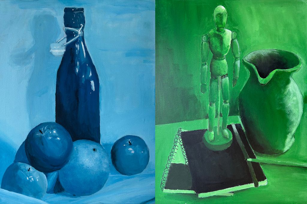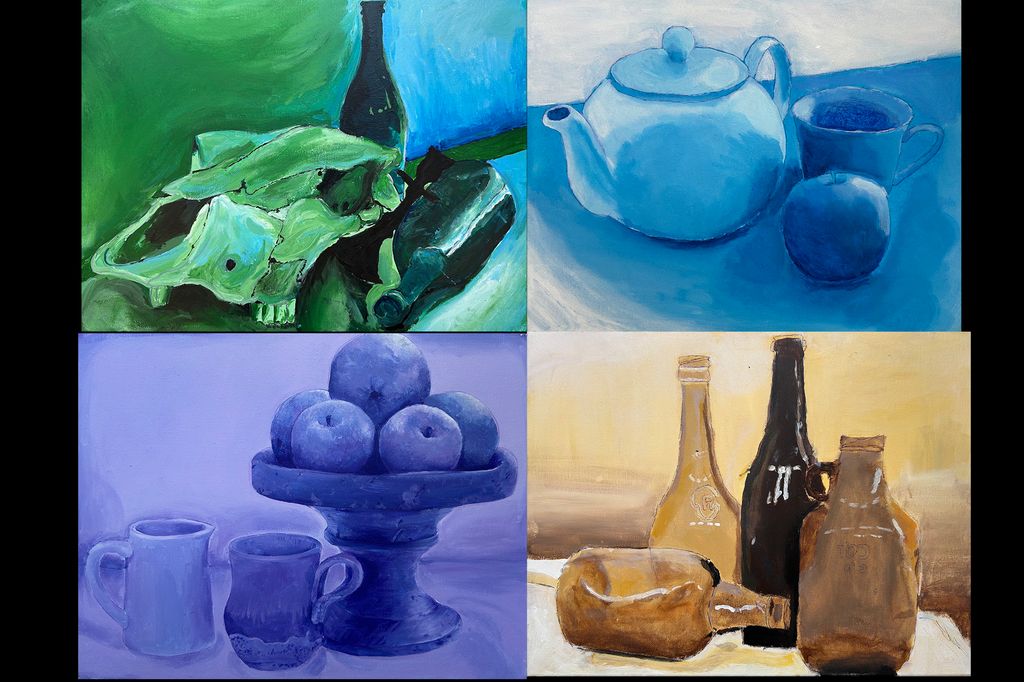 Year 8 students recently completed a still life painting project that focused on using a monochromatic palette to explore tone, form, and depth. Working with a range of provided objects – including bottles, fruit, a tea set, skull, mannequin, and shells – students created and photographed multiple arrangements before selecting their strongest composition to develop as a painting.